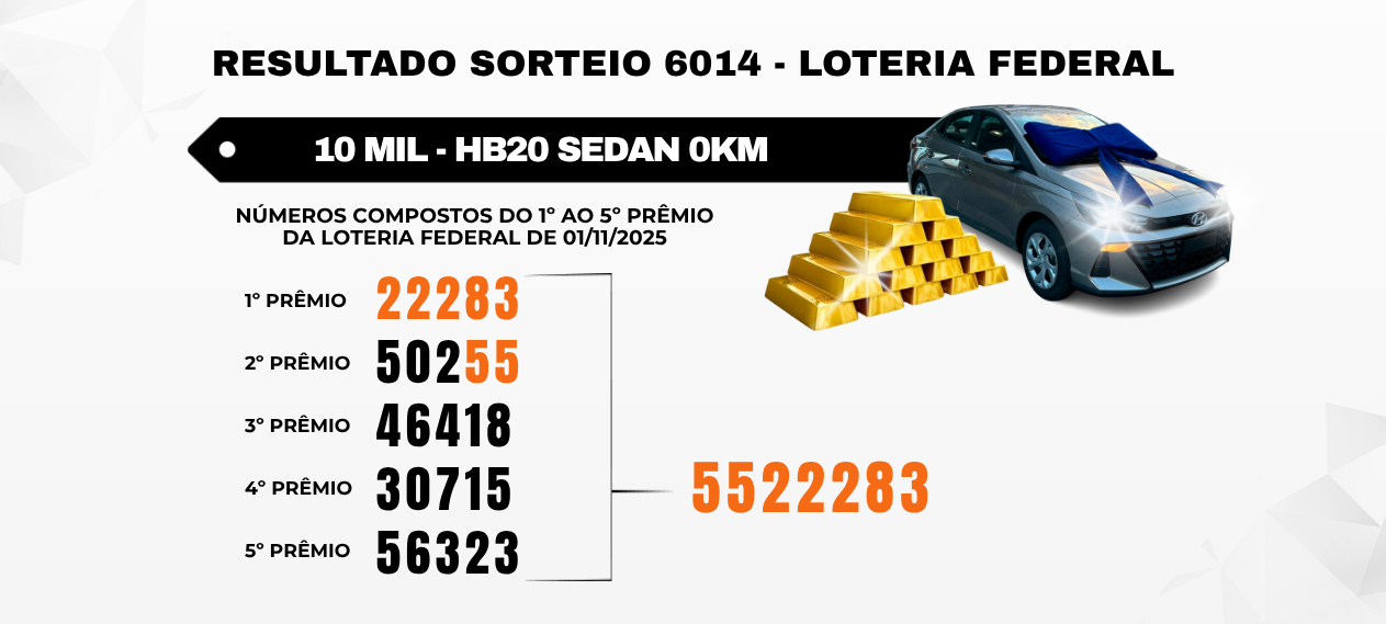 Os números foram extraídos diretamente do sorteio realizado pela Loteria Federal no concurso de número 6014 no dia 01 de Novembro de 2025 conforme descritos abaixo: