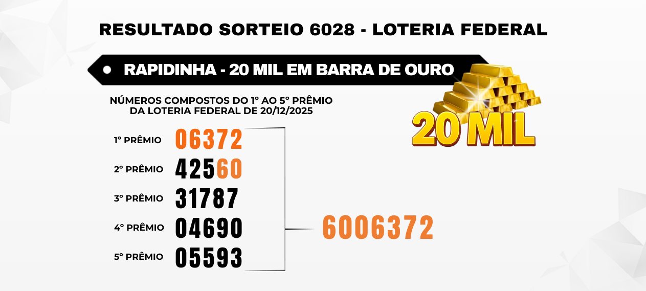Os números foram extraídos diretamente do sorteio realizado pela Loteria Federal no concurso de número 6028 no dia 20 de Dezembro de 2025 conforme descritos abaixo: