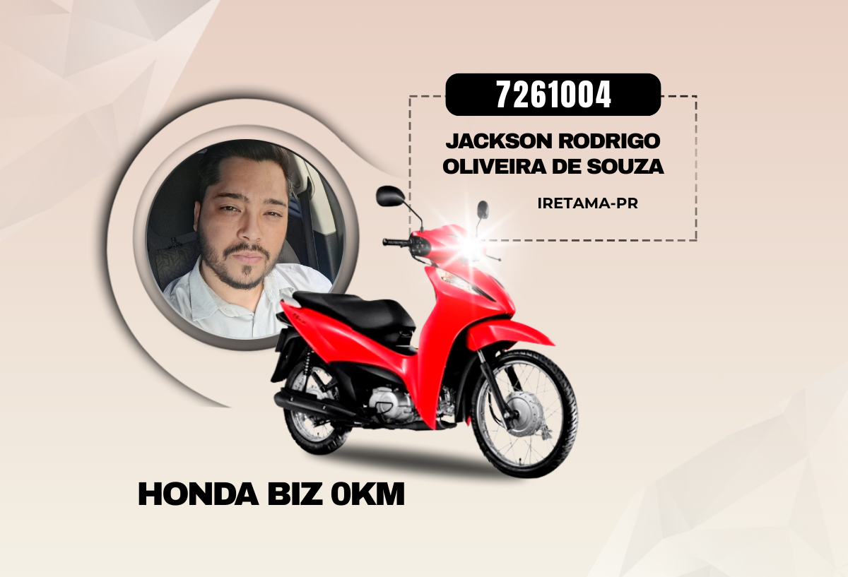 No dia 24/09/2025, mais um participante viu sua sorte brilhar em grande estilo levando para casa uma maravilhosa Honda Biz 0km. O contemplado da vez foi Jackson Rodrigo Oliveira de Souza, da cidade no interior do Paraná chamada Iretama.