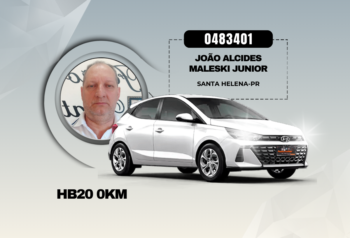 Nosso amigo João Alcides Maleski Junior, da cidade de Santa Helena-PR teve finalmente sua persistência recompensada por levar para casa um maravilhoso HB20 Comfort Plus 0km no sorteio realizado no dia 24/09/2025.