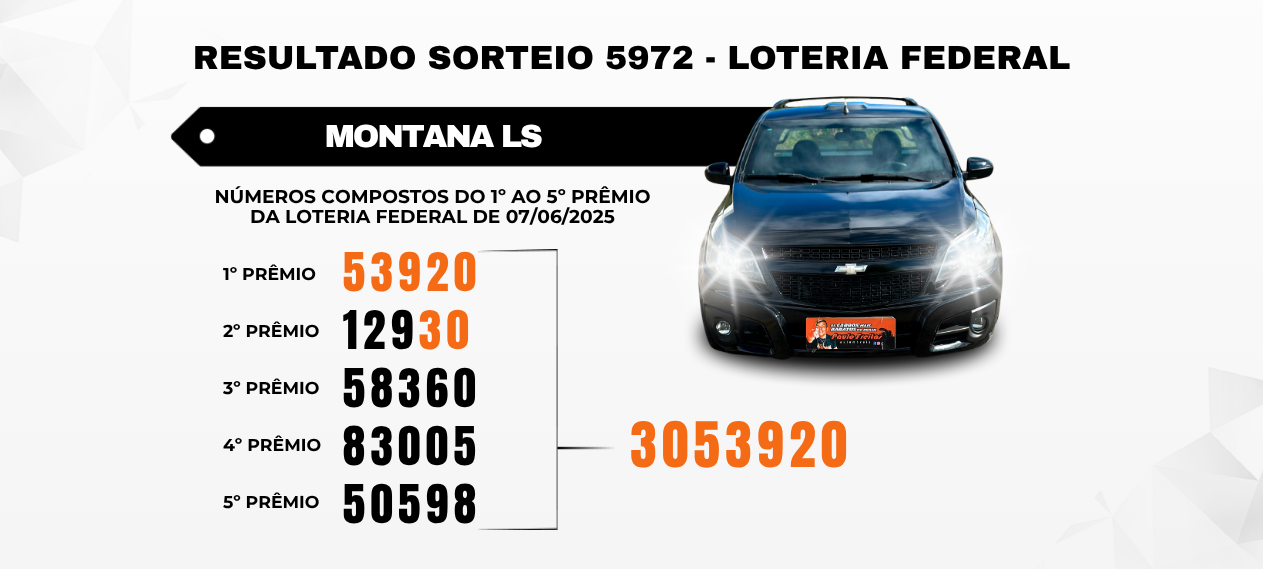 Os números foram extraídos diretamente do sorteio realizado pela Loteria Federal no concurso 5972 no dia 07 de Junho de 2025 conforme descritos abaixo: